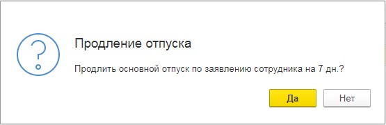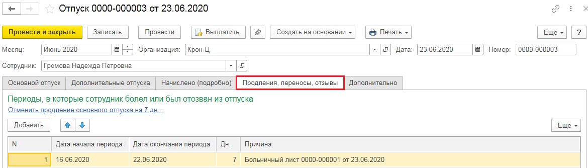 В графе сообщений возникнет надпись  «Основной отпуск продлён на 7 дней. Дата окончания перенесена с 28.06.2020 на 05.07.2020».