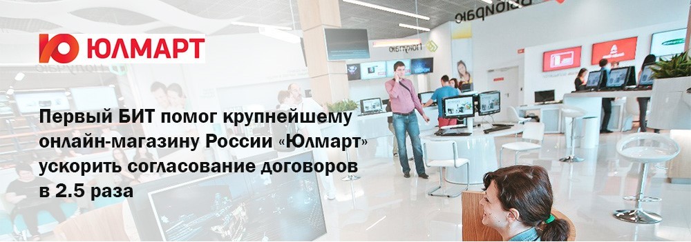 ОПИСАНИЕ ПРОЕКТА Компания «Юлмарт», находясь в фазе бурного роста, давно испытала необходимость в переходе на новые технологии, в том числе, необходимость в переходе к электронному документообороту. Но в конце 2013 года, создавая новый формат бизнеса, компания поняла – промедлив сегодня завтра мы окажемся в числе догоняющих. Тщательный анализ рынка привел к сравнению интересных решений, представляемых различными достойными компаниями. После ряда двухсторонних встреч между проектным офисом компании «Юлмарт» и специалистами Центра по работе с корпоративными клиентами компании «Первый БИТ», было принято решение о старте пилотного проекта на базе программы 1С:Документооборот. Для оперативного разворачивания базы был использован облачный сервис компании Первый БИТ – «БИТ.ЛАЙВ», что позволило не только организовать рабочую среду за 2 дня, но и существенно снизить инвестиционные затраты на первом этапе внедрения и загрузку технических специалистов Заказчика. За четыре месяца с момента установки программы специалисты департамента согласовали более 800 договоров аренды по всей России, при этом процесс согласования стал прозрачным, а срок сократился с семи до трех дней. Второй этап проекта подразумевает запуск штрих-кодирования, для которого необходимы принтеры штрих-кодов и сканеры, уже имеющиеся в Юлмарте. После запуска ИТ-проекта компания «Юлмарт» осуществляет сопровождение внедренных информационных систем по договору формату SLA с компанией «Первый БИТ»